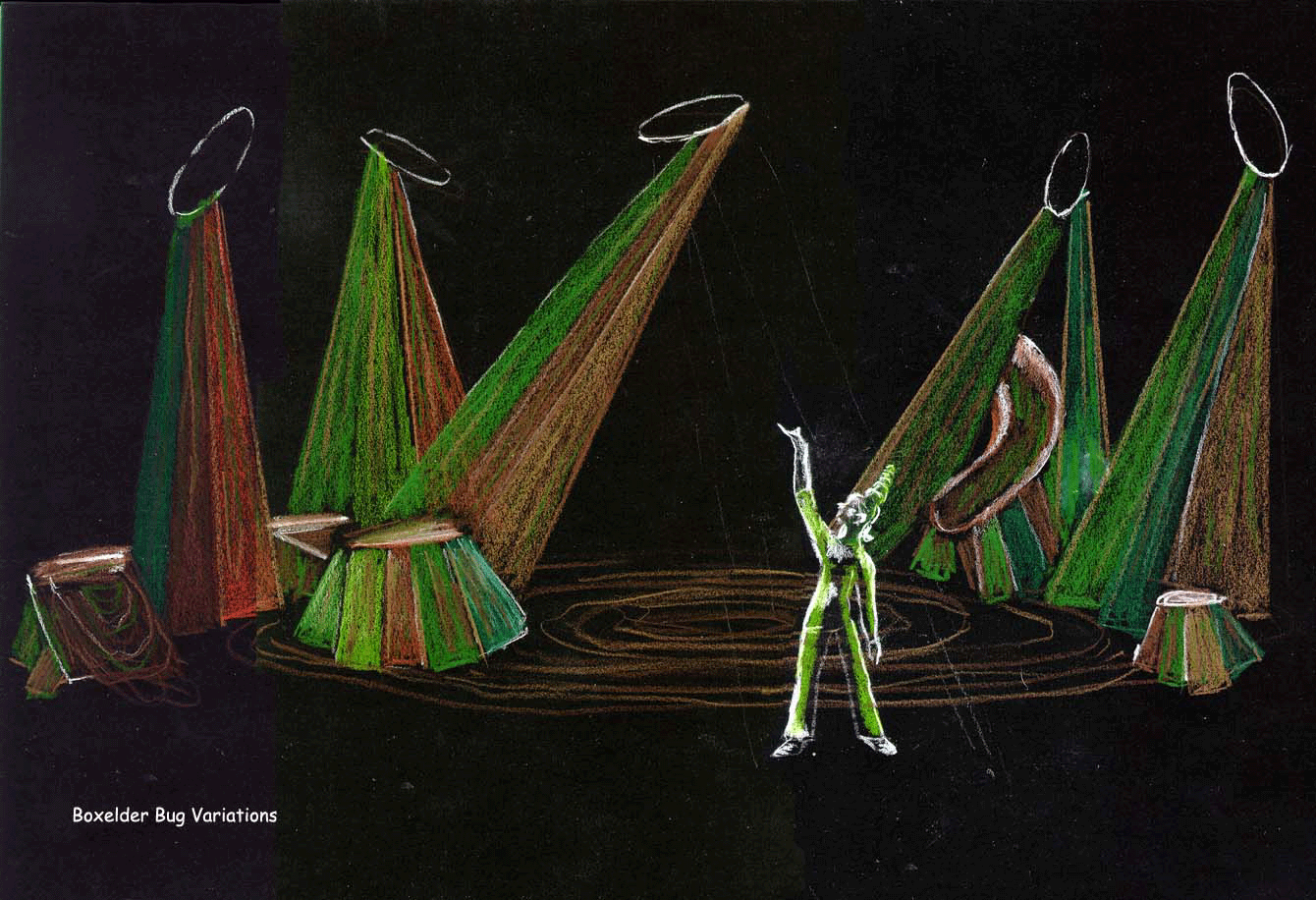 "Boxelder Bug Variations" takes place in a tree...we think...with bugs/people...we believe...who invite us into their world of music and poetry. The environment consists of a slide for entrances and exits, a ramped platform stage right, a unit which will house a synthesizer and a stump/organic unit for sitting or standing. Around the stage are "knot holes" connected by mottled stretchy cloth secured to the ground...tendrils through which the bug/people can slide through and hide behind.